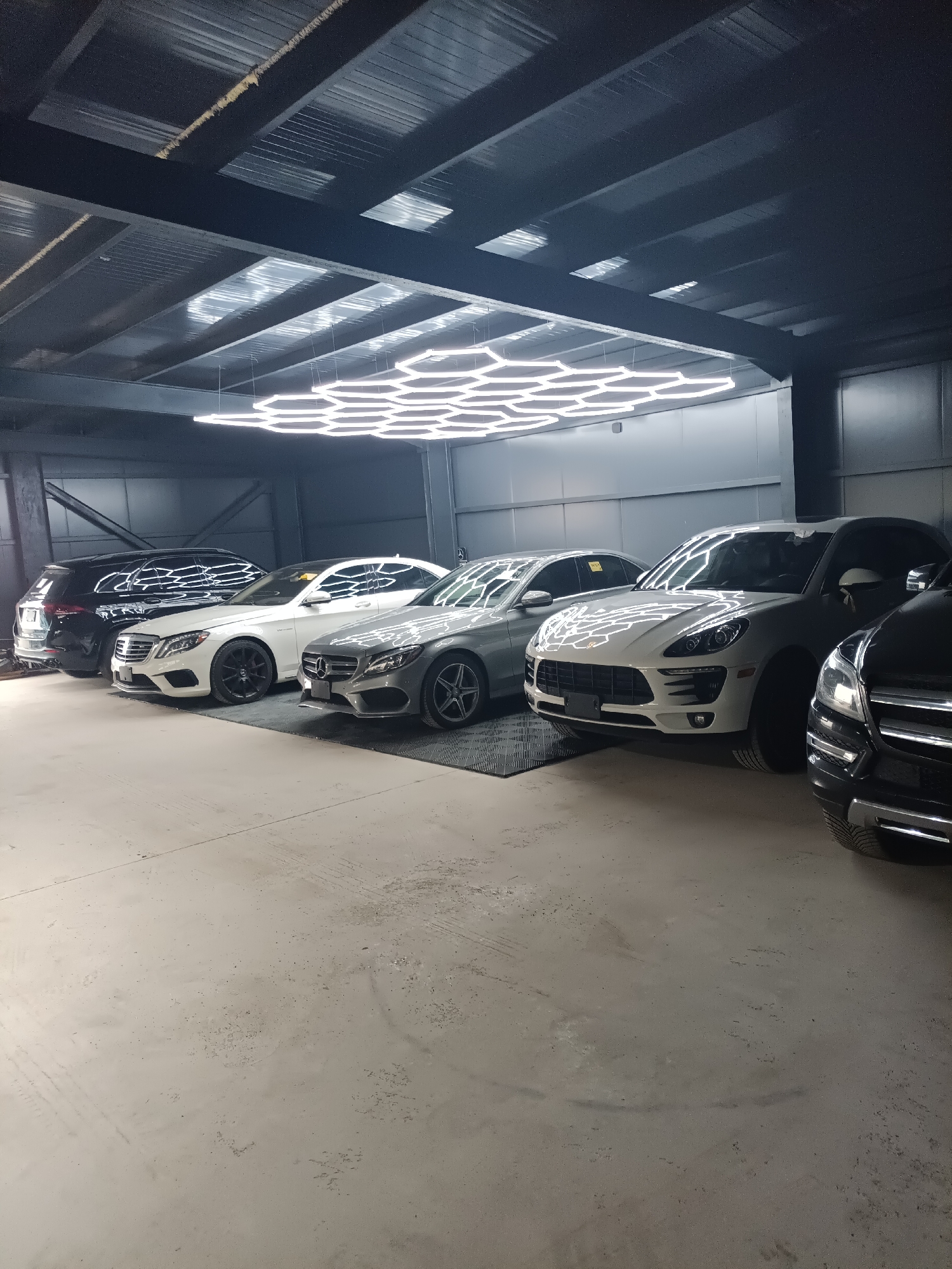 The image depicts a large, indoor space resembling a car detailing shop or showroom, potentially in Mramor, Bulgaria (based on the prompt). The room has a dark, corrugated metal ceiling with a unique, hexagonal LED lighting fixture illuminating the space. Several luxury cars are parked in a row, including Mercedes-Benz and Porsche models, in various colors such as black, white, and gray. The floor is a light-colored, polished concrete. The scene appears clean and well-lit, suggesting a professional environment. There are no people visible in the image.