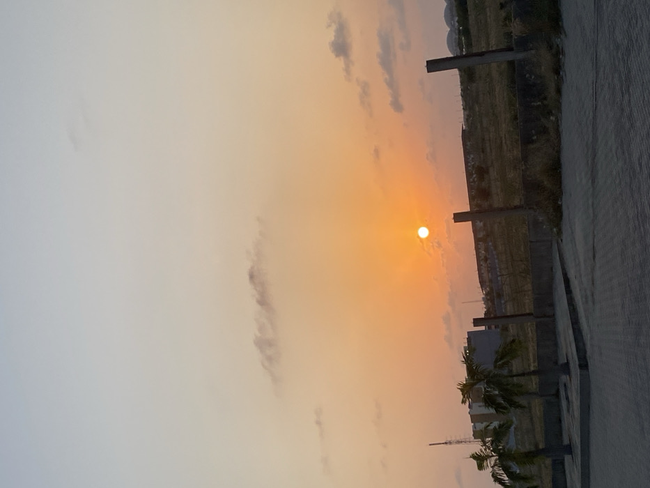 An orange sun dominates the sky, hinting at either sunrise or sunset. Wispy clouds are scattered throughout the sky, adding depth to the scene. The landscape features concrete pillars and a patch of land, alongside palm trees, and some buildings in the background. The ground has a concrete-like texture. The photo is rotated sideways, making the sky appear on the left and the ground on the right.
