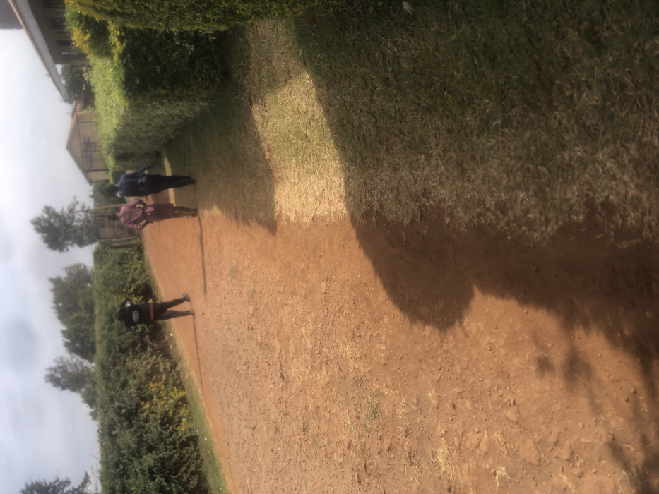 A dirt path stretches into the distance, flanked by neatly trimmed hedges and grassy areas. Three individuals walk along the path, their figures blurred by the camera's focus. The scene is bathed in sunlight, casting long shadows across the ground. The sky is overcast, suggesting a humid environment. The perspective and image rotation distort a clear depiction of the setting, yet imply a natural, outdoor location.