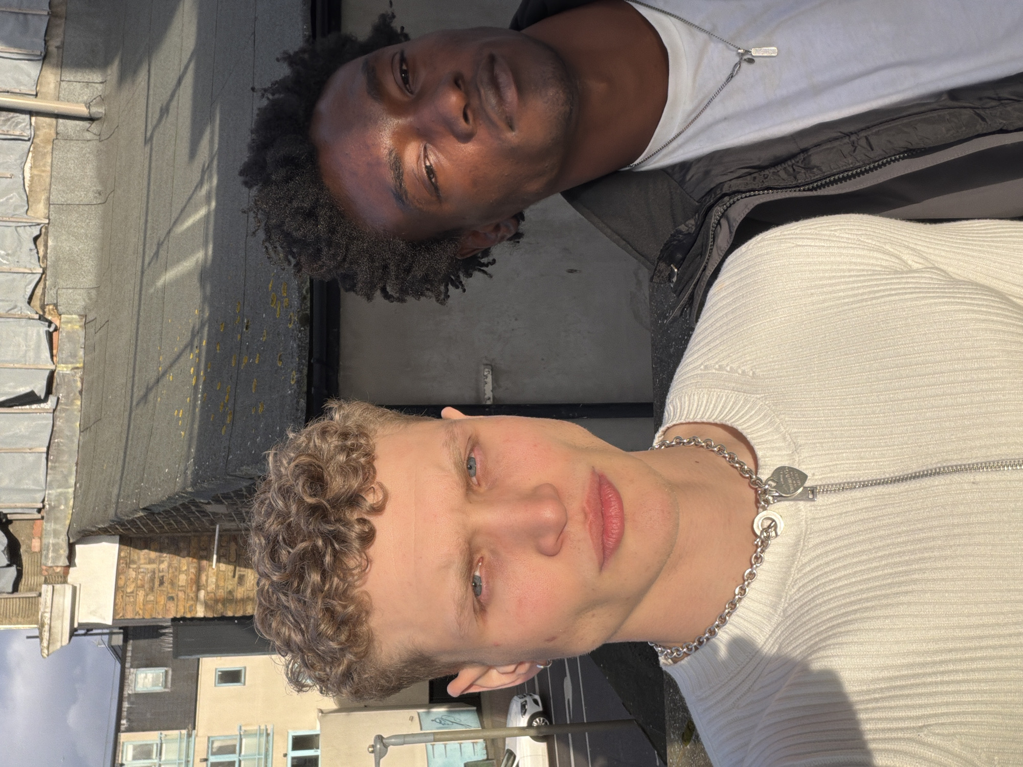 Two young men are standing together on a rooftop in London, United Kingdom. One has dark skin and curly hair, wearing a white t-shirt underneath a dark-colored jacket and a silver necklace. The other individual has fair skin and curly hair, wearing a white zip-up sweater, and a silver chain necklace. The background shows rooftops and buildings characteristic of a London urban environment.