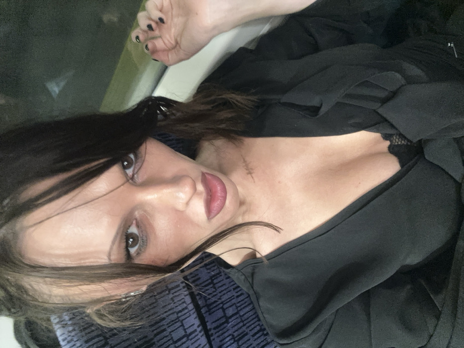 A close-up, chest-up portrait features a female subject with dark, long hair and dark eyes, gazing directly into the camera. She wears a dark, V-neck top, revealing a dark, possibly lace, undergarment. A visible, linear scar with small, perpendicular marks is present on her upper chest, below the neck. Her left hand is partially visible on the right side of the frame, with fingers splayed and nails painted black. The background suggests an interior environment, specifically a train carriage, evidenced by a patterned blue and white fabric consistent with seat upholstery on the left, and a window reflecting interior light with a blurred, greenish exterior view on the right. The scene is located within a train in Tunbridge Wells, United Kingdom.
