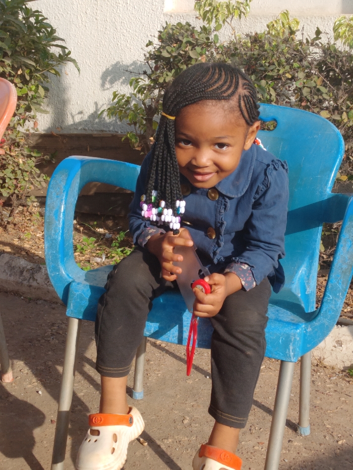 A young girl sits on a bright blue plastic chair outside. She wears dark pants, a blue collared shirt with brown buttons, and white sandals with orange straps. Her hair is styled in braids, some adorned with colorful beads. She holds a clear plastic object with a red string in her hands. The background features green shrubbery and a light-colored wall.