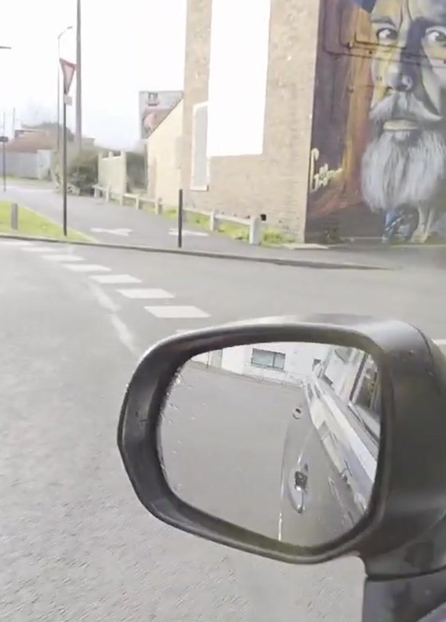 drive-by view of several murals on buildings in a town. The perspective is from inside a car, showing a car door and side mirror. The car drives past a building with a large, detailed mural of a bearded man with a hat. Then, the car passes a building with abstract mural designs. Finally, the car passes a brick building with additional murals and partially boarded-up windows. The environment appears to be a residential neighborhood. The day is overcast.