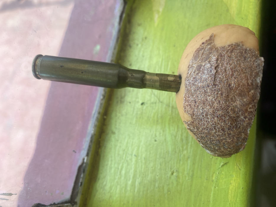 - "This scene, located in Nairobi, Kenya, depicts a single spent rifle cartridge casing embedded vertically into a section of a natural object" by FM-nhoeR2, licensed under CC BY 4.0