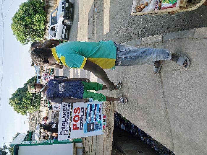 Two individuals stand on a sidewalk next to a drainage ditch filled with refuse. One person wears a blue and green shirt with a yellow collar and light-colored jeans. The second person has on a blue shirt with "Emirates" printed on it and green pants. They are standing next to a sign advertising "SOLAKEM Communications POS available here," depicting a handheld device with various services listed. In the background, there are other people, cars, and a fruit stand. A lush green tree is visible in the distance.