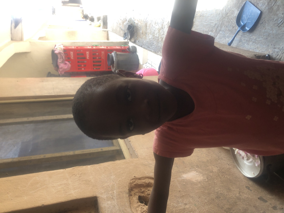 A young child, centrally positioned, faces forward with arms extended horizontally. The child has short, dark hair, dark skin, and wears a pink short-sleeved shirt. Small earrings are visible on the child's ears. The scene is located in Lokoja, Nigeria. To the child's left, a textured, light-brown wall with a window is present. On the ground to the left, a metal pot contains white, sliced vegetables, likely onions. To the right, on a concrete surface, a blue leaf-shaped dustpan is visible. In the background, to the right, a stack of red Coca-Cola crates stands against a light-colored pillar or wall. Adjacent to the crates are a dark cylindrical bin and scattered dark footwear. The area beyond the crates is brightly lit, suggesting an open passage or alleyway.