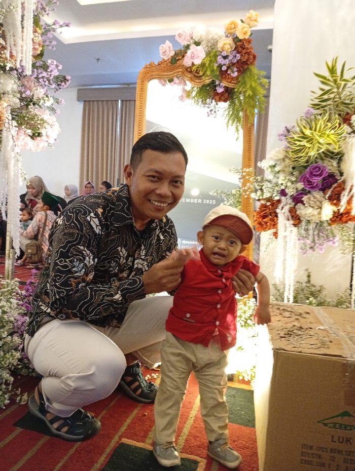 A smiling man in a patterned shirt and white pants kneels beside a young child wearing a red shirt, beige pants, and a cap. The child appears slightly unsteady. They are positioned in front of a large cardboard box. Behind them, there's a decorated mirror and floral arrangements, suggesting a celebratory event. Several women in headscarves are visible in the background.