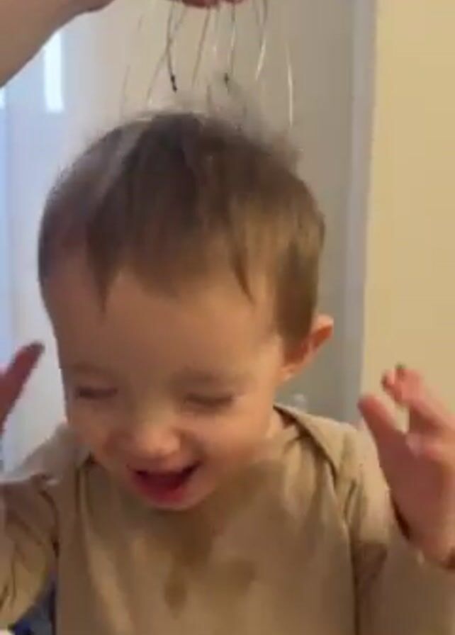 A toddler with short brown hair and a beige shirt is laughing and playing with a silver head massager held above them