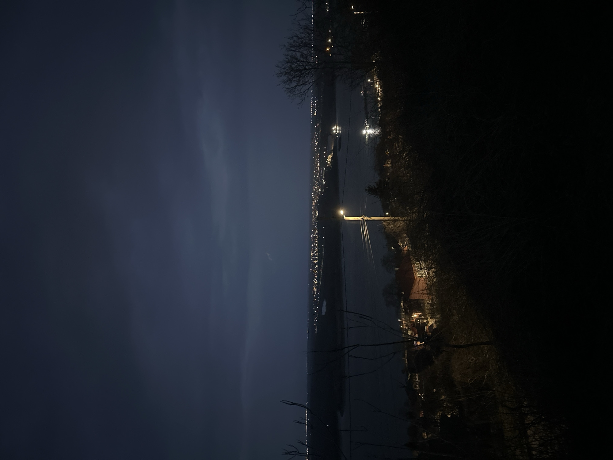 The image depicts an elevated nighttime view overlooking the city of Tutrakan, Bulgaria. A vast, dark body of water, likely the Danube River, horizontally traverses the midground, reflecting numerous artificial lights from both banks. The sky above is a deep, overcast blue-grey. In the foreground, the scene is dominated by dark, silhouetted deciduous trees and brush, suggesting a hill or embankment from which the photograph was taken. The bare branches of several trees are prominent on both the left and right sides. On the left side of the midground, a single bright yellow street lamp on a pole illuminates a small section of the immediate lower slope and casts a strong reflection onto the river. Below and to the right of this lamp, the reddish roof of a building is partially visible, interspersed with other indistinct structures and light sources. Along the far bank of the river, numerous scattered lights delineate the extent of urban development, extending into the distant horizon. No individuals, animals, or specific actions are discernible within the frame. The overall environment is urban, observed from an elevated, natural vantage point under a dark, cloudy sky.