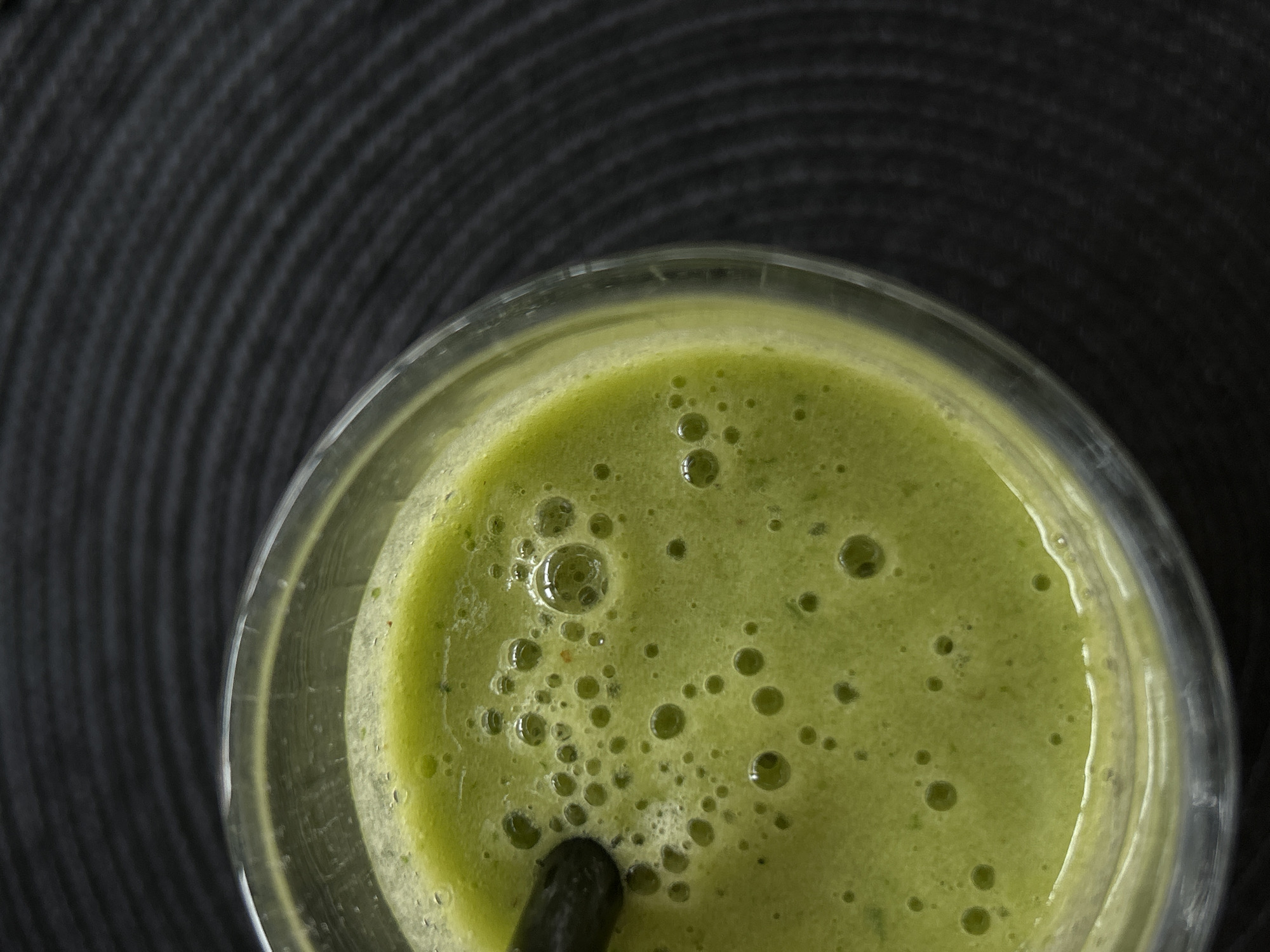 - "A top-down shot shows a glass of green smoothie with a black straw, resting on a textured, dark gray surface" by FM-MoDxr2, licensed under CC BY 4.0