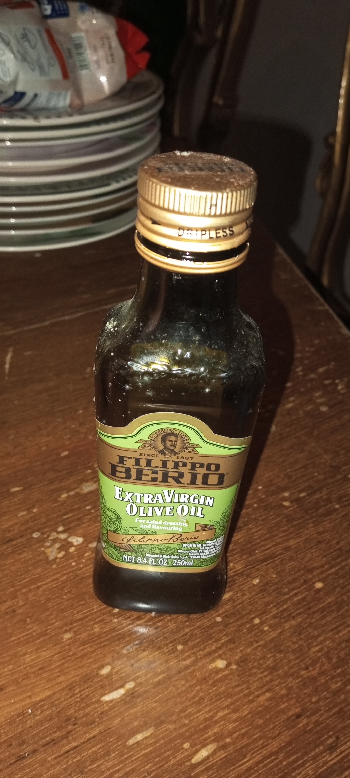 An olive oil bottle stands prominently on a wooden surface. The bottle, labeled "Filippo Berio Extra Virgin Olive Oil," features a green and gold label. The bottle's cap is gold, with "Dripless" printed on it. To the left of the bottle, a stack of plates and what appears to be snack bags is visible. The wooden surface has small, scattered droplets. The photo's lighting is dim, casting shadows on the scene.