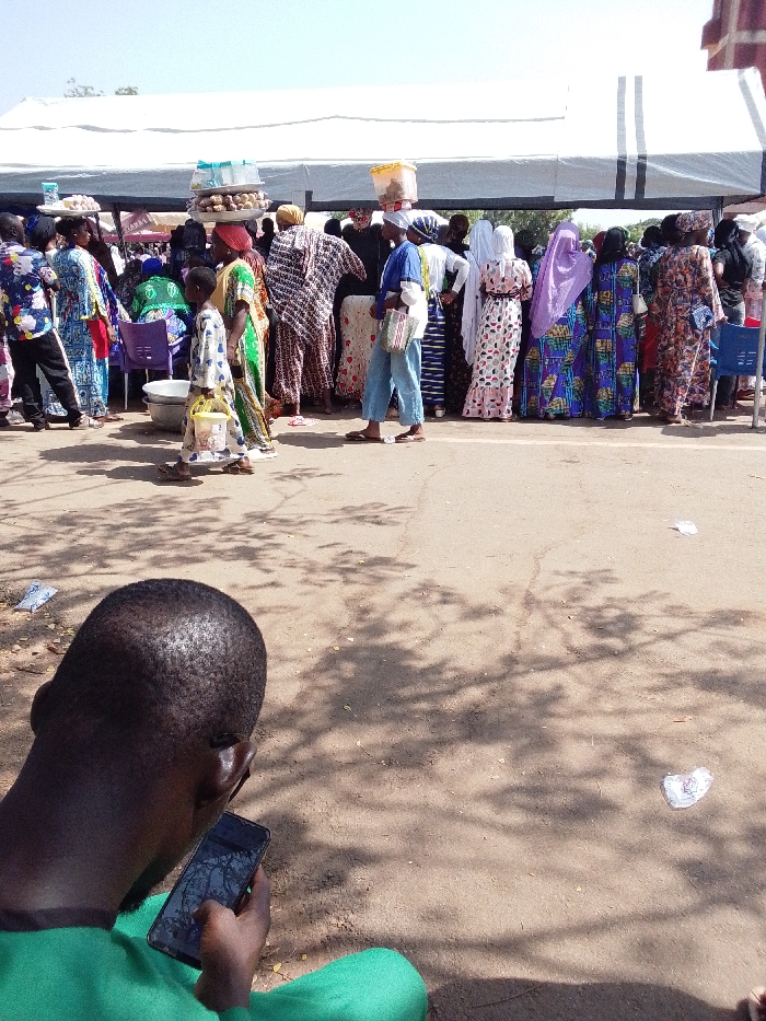 This image depicts an outdoor gathering, likely a market or community event, in Tamale, Ghana