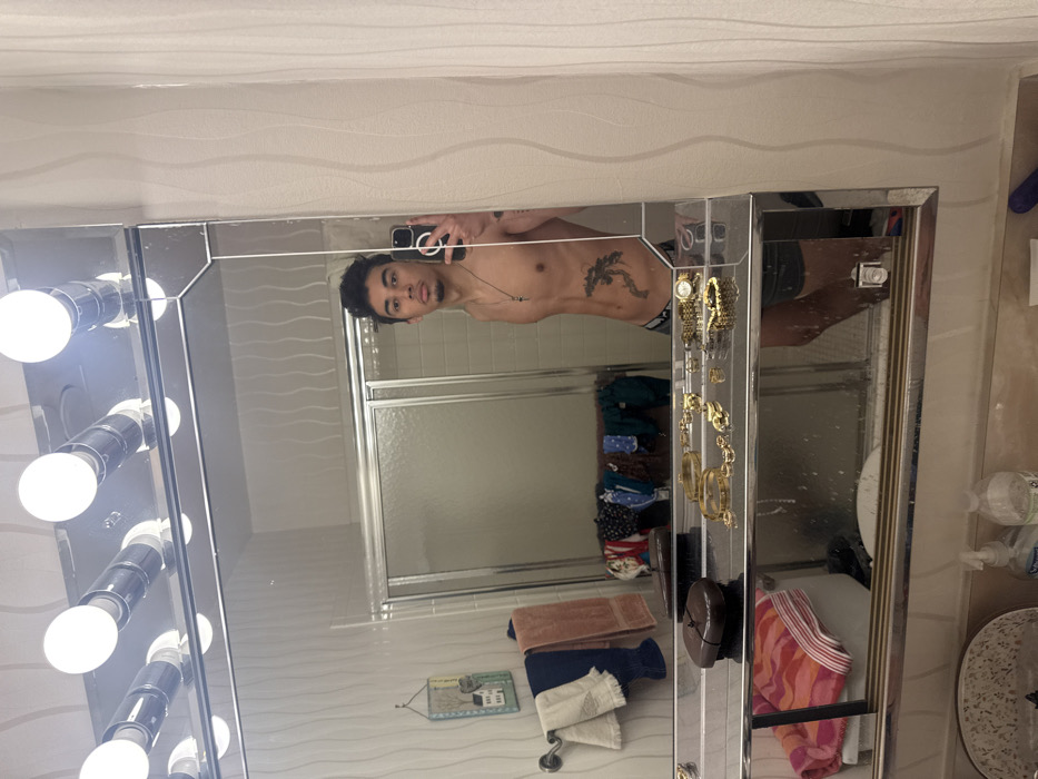 A person with a tattoo on their torso is visible in a bathroom mirror, taking a selfie with their phone