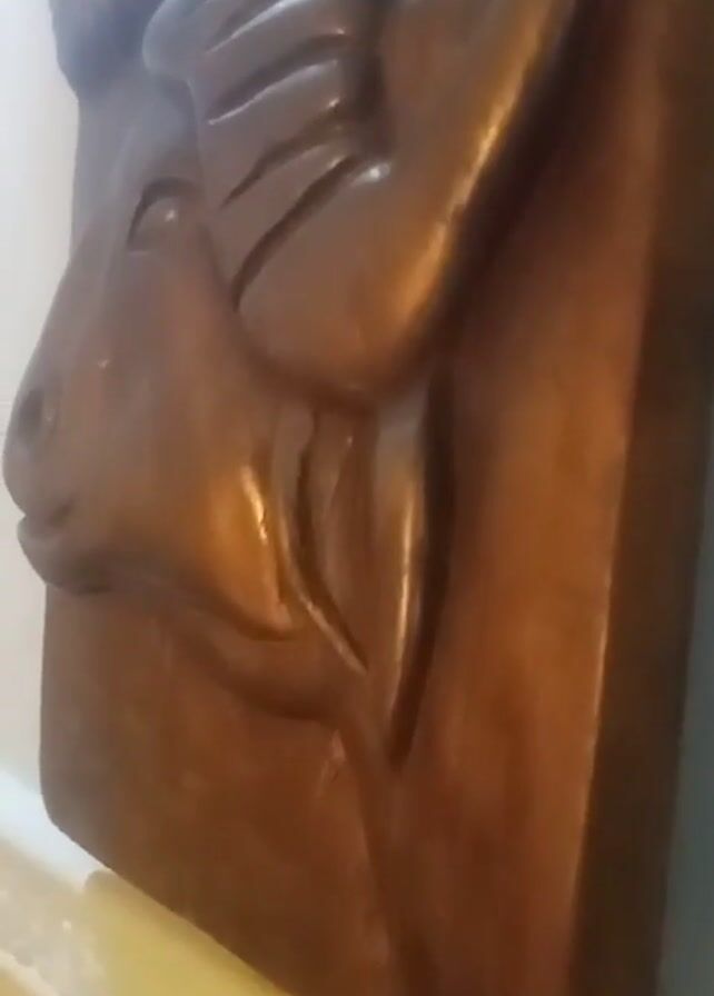 close-up of a wooden carving. The carving depicts the head of a bull, with a hand resting on top of its head. The wood has a smooth, varnished finish, and the carving is detailed, showing the bull's eye, nose, and the individual fingers of the hand. The carving is set against a background of a white wall and a yellow surface. The camera slowly zooms in on the bull's face. The environment appears to be indoors.