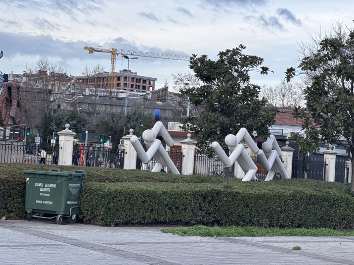 The image depicts an urban scene in Zeytinburnu, Istanbul, Turkey, under an overcast sky. In the foreground, a gray paved area leads to a large, green, wheeled municipal waste container displaying "İSTANBUL BÜYÜKŞEHİR BELEDİYESİ" text. Behind the container and extending across the mid-ground is a meticulously trimmed green hedge. Embedded within or immediately behind this hedge is a series of five abstract, light-colored human-like sculptures, interlinked and depicted in dynamic, running postures. Behind these sculptures, a decorative black wrought-iron fence is punctuated by ornate white stone pillars. Further back, a street is visible with blurred pedestrian figures and green traffic lights. Trees with both bare and green foliage are scattered throughout the background. In the distant left, a large, reddish-brown, organic-shaped sculpture is visible. The skyline features various buildings, including one under construction with exposed rebar and concrete framing, overlooked by a prominent yellow construction crane.