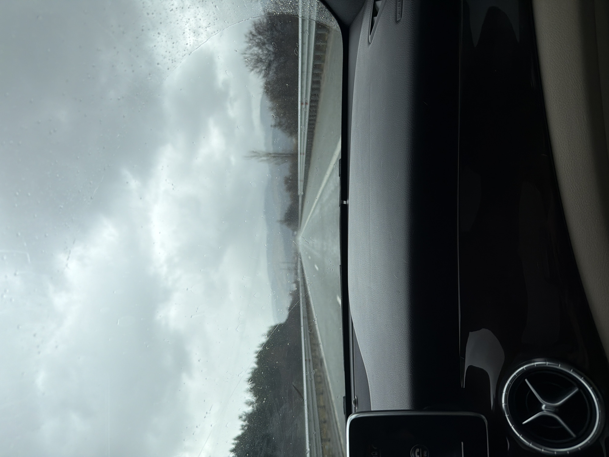 The image depicts a view from inside a car traveling on a highway. Outside, it is a cloudy, overcast day, and rain is visible on the windshield. The road stretches ahead, disappearing into the distance. Trees line the side of the road. Inside the car, part of the dashboard is visible, including an air vent. The precise location within Studena, Bulgaria, cannot be determined from this image alone. The image does not show any people, specific actions, or interactions. It depicts a car moving on a highway during a rainy, overcast day.