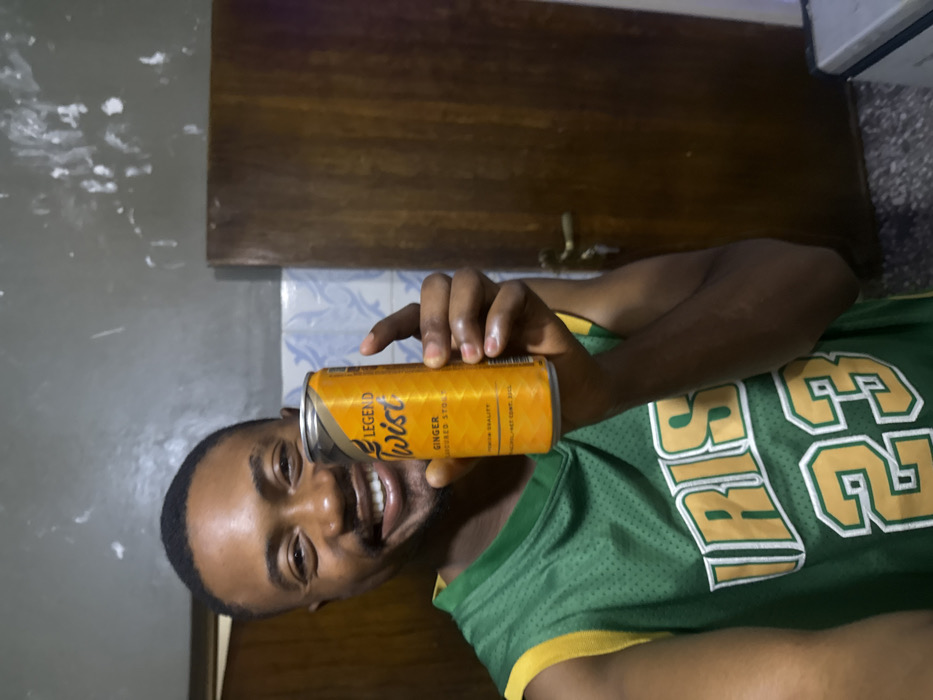 A smiling man wearing a green and yellow jersey with the word "IRISH" and the number "23" is holding a can of "Legend Twist Ginger Flavored Stout" in his right hand. The background includes a dark wooden door, a tiled wall, and a gray wall with white spots. The lighting appears to be indoor and somewhat dim, focusing on the man and the can. The photo appears to be taken with the phone turned sideways.