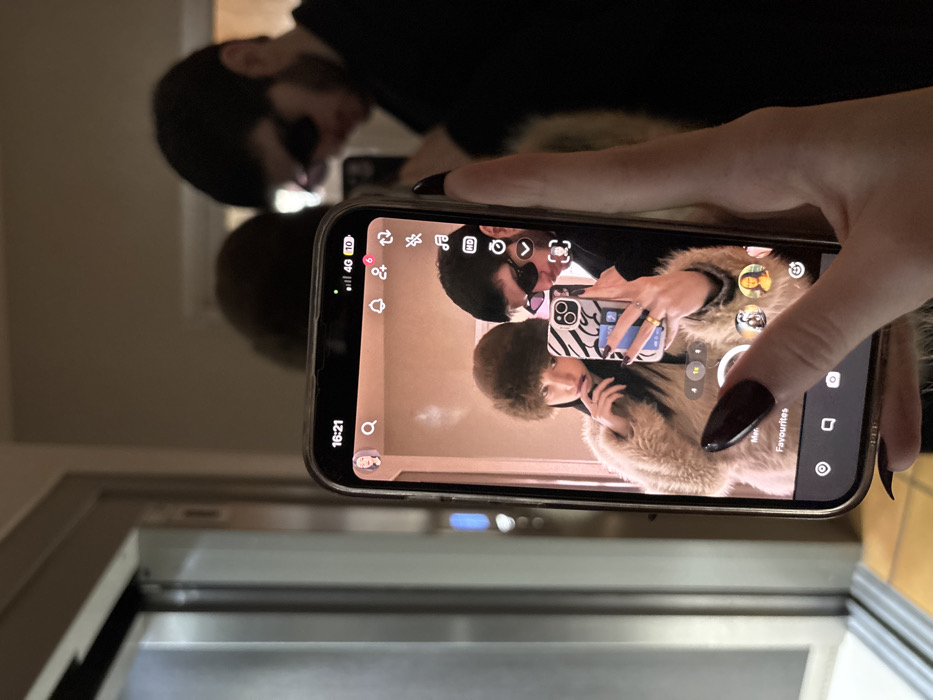 A photo of a phone screen displaying a selfie of a couple. The man wears sunglasses and a black top. The woman sports a fur coat and holds a phone with a patterned case. Their reflection is visible in a mirror behind the person holding the phone. A hand with dark nail polish is holding the phone up to take a picture of the reflection in the mirror.