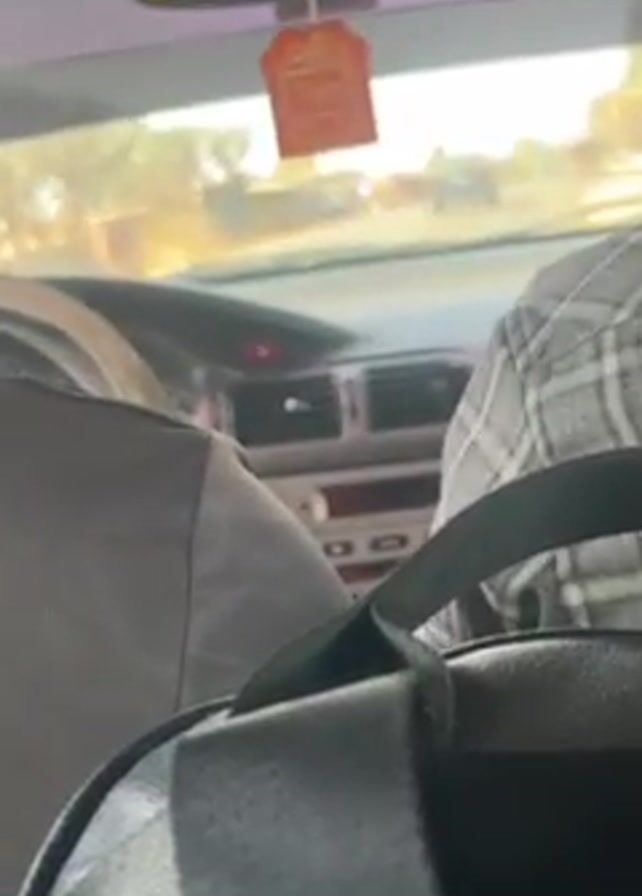 view from the backseat of a car, looking towards the front. The driver is visible, wearing a grey and white checkered shirt and a black cap or head covering. The front passenger's seat is also visible, with a grey seat cover. A black backpack with a grey pattern and a black strap sits in the foreground, partially obstructing the view. The car is moving along a road in a sunny environment. A small orange air freshener hangs from the rearview mirror. Other cars and buildings can be seen outside the windshield. The interior of the car is beige or light grey.