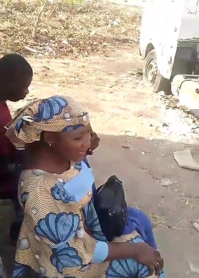 A woman wearing a patterned headscarf and dress sits on a block in an outdoor setting. A young person stands behind her, appearing to attend to her hair. A small black bag rests on the woman’s lap. In the background, there’s a white vehicle, some debris, and vegetation. A makeshift wooden structure is visible to the left. The woman is looking to her right and appears to be talking.