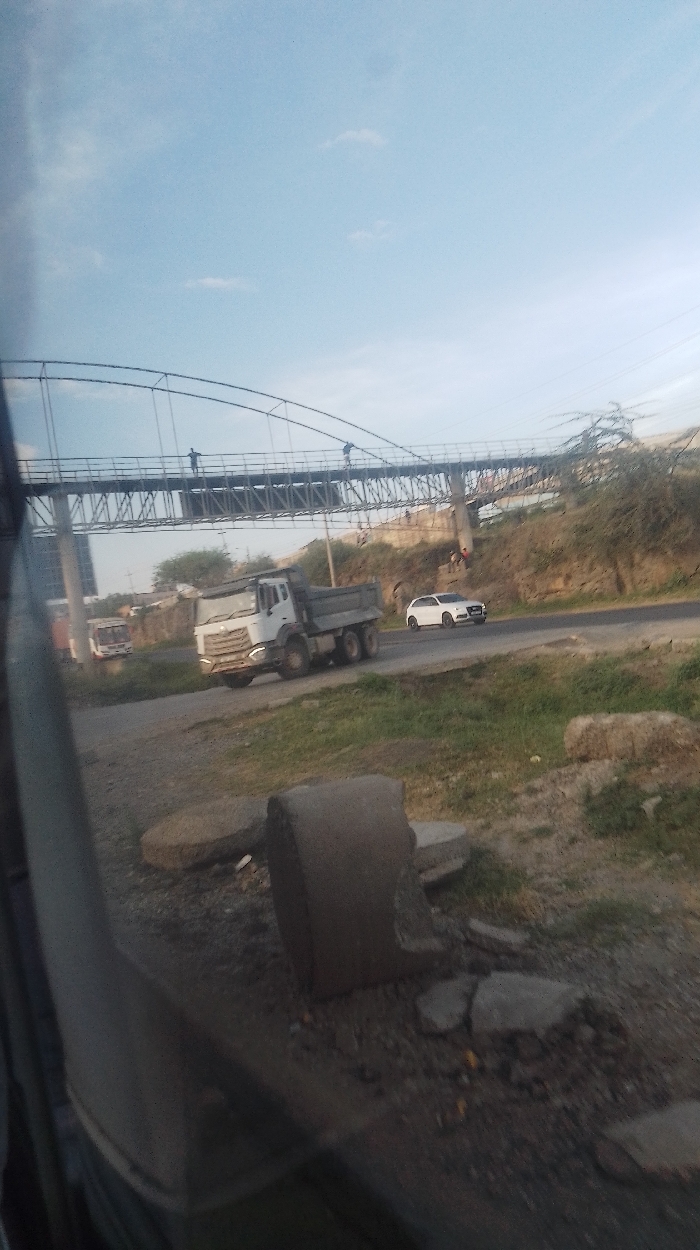 The image captures an outdoor scene in the Syokimau-Mulolongo ward, Kenya, featuring a road, vehicles, a pedestrian bridge, and multiple individuals under a clear sky. In the immediate foreground, a dark, angled structure, likely a vehicle's interior window frame, partially obscures the lower left. The ground consists of dirt and gravel, interspersed with sparse dry grass and broken concrete pieces, including a large, curved, partially shattered concrete pipe section standing upright and a flat, circular concrete slab. In the midground, a paved road stretches horizontally. A large, white and dark-colored, multi-axle dump truck travels left on the road. Further right and slightly behind the truck, a white SUV or hatchback is visible, also on the road, heading right. To the far left, a white and red passenger bus is partially visible on a dirt shoulder or side road. The area adjacent to the road on the right is an earthen embankment covered with sparse dry vegetation and some small trees. Above the road, a metal pedestrian bridge with arching top supports spans the scene. At least two individuals are present on the bridge: one stands on the main walkway near the left, and another is positioned further right, appearing to be on the upper arching structure. Below the bridge on the right embankment, several other individuals are visible. In the distant background on the left, faint outlines of multi-story buildings are discernible. Overhead power lines are visible against the sky on the right side. The sky above is light blue with scattered white clouds.