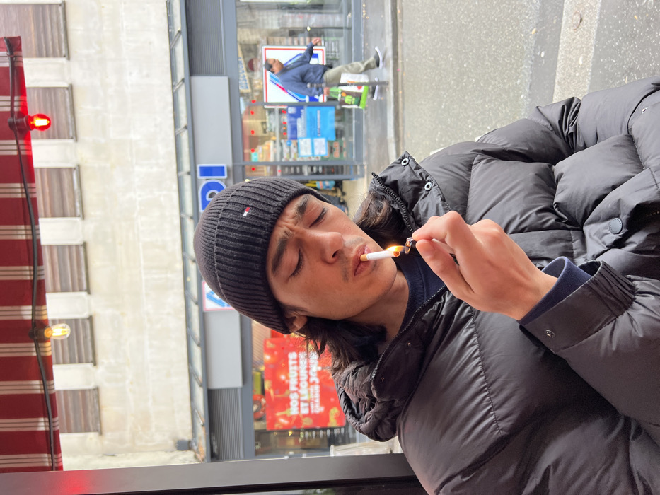 A male subject is captured in a close-up, igniting a cigarette outdoors in Paris, France