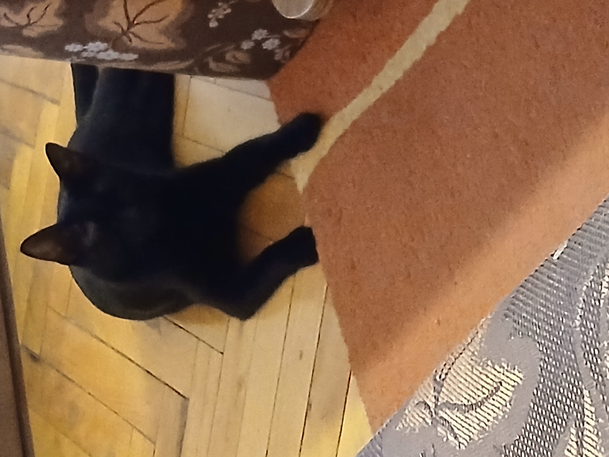 - "A black cat lies on a wooden floor near a brown rug with a white stripe" by FM-HftPs1, licensed under CC BY 4.0