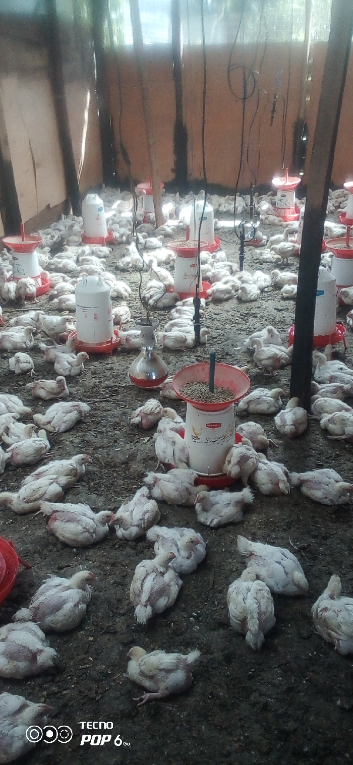 Within a poultry shed located in the city of Unknown, Unknown, a dense population of hundreds of white-feathered broiler chickens occupies the entirety of the dirt floor
