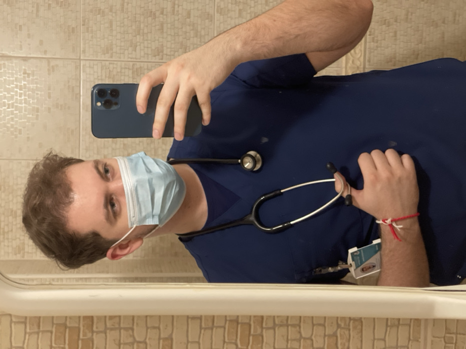 A young adult male is depicted in a mirror selfie taken within a tiled interior space in Varna, Bulgaria. The subject has brown, wavy hair and is wearing a light blue disposable surgical mask covering his nose and mouth. He is dressed in dark blue medical scrubs, with a black stethoscope draped around his neck. A partially visible white medical identification badge is clipped to his left scrub top. A red and white braided string bracelet is tied around his left wrist. The male is holding a dark blue smartphone, featuring a triple camera array on its rear, in his right hand to capture the image. The reflected background consists of light-colored, rectangular wall tiles arranged in a horizontal pattern, with a white vertical frame visible on the left side of the reflection.