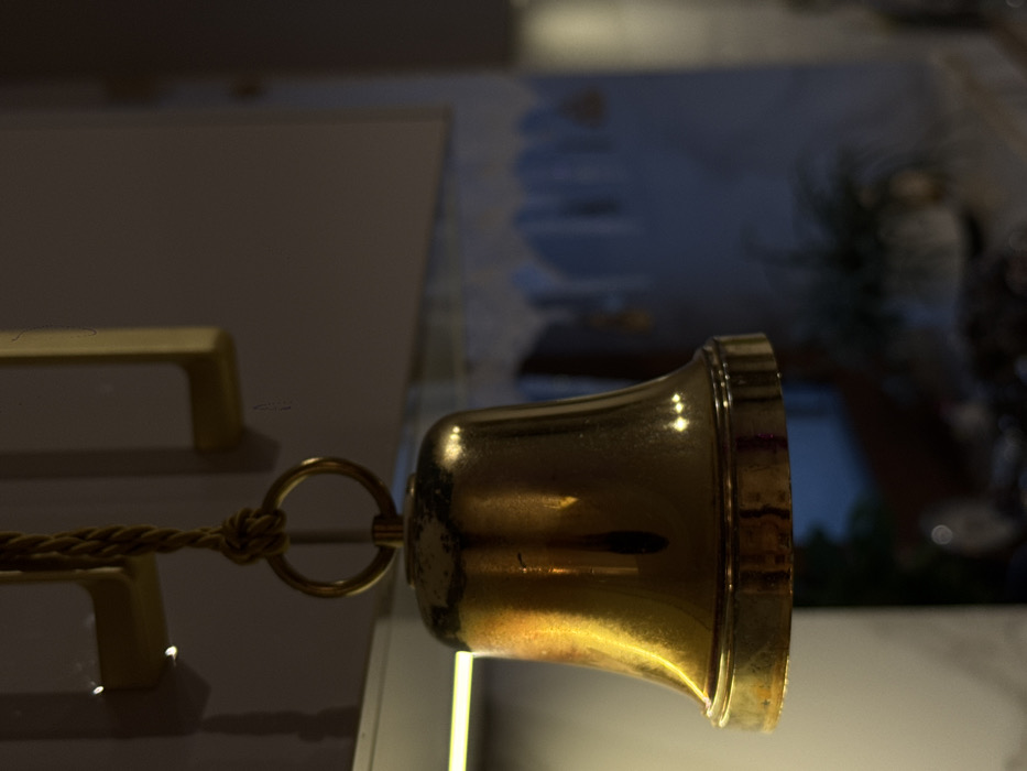 The image depicts an indoor scene in Klimkówka, Poland, centered on a brass-colored bell. The bell hangs from a twisted golden cord, which is secured by a knot around a circular metal ring attached to the bell's apex. Above the bell, two L-shaped gold-colored handles are affixed to a light-colored cabinet or shelf. A horizontal LED light strip is visible beneath the cabinet. The background is out-of-focus and dimly lit, revealing indistinct shapes consistent with household objects, including a potential potted plant, against a muted blue-grey backdrop. The bell's surface exhibits reflections from an unseen light source, indicating an artificial illumination within the interior space. No individuals, explicit actions, or interactions are present.