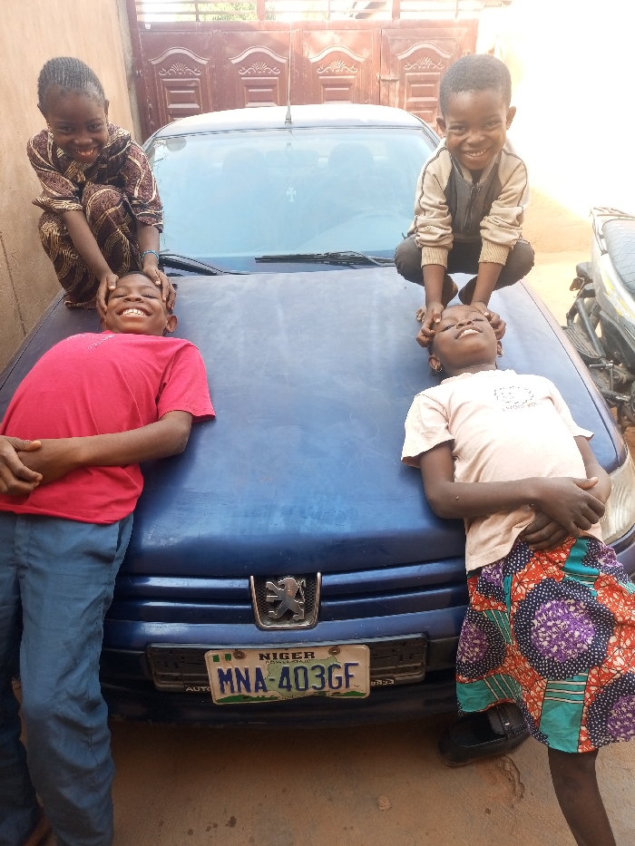 Four children play on a blue car outdoors. Two children lie on the car hood. One child on the left has a red shirt and blue pants, while the child on the right has a light-colored shirt and a patterned skirt. A smiling child kneels behind each of them, placing hands on their heads. The car has a visible license plate with "NIGER MNA-403GF" printed on it. A gate and a motorcycle are visible in the background.