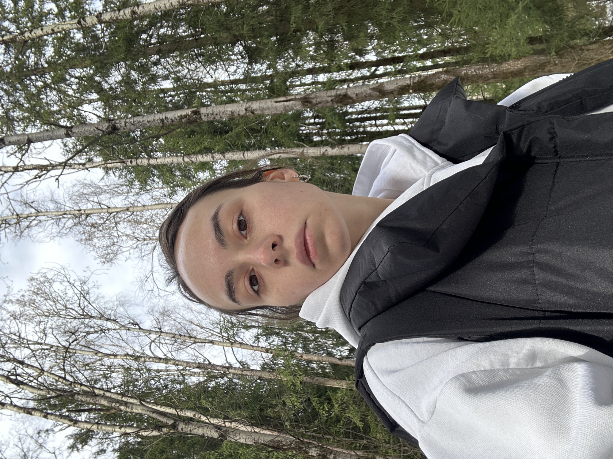 A young adult female is depicted in a close-up portrait, framed from the chest up, in a forested area of Trudovaya, Russia. She has dark hair, a fair complexion, and a neutral expression, looking directly into the camera. She wears a white hooded sweatshirt beneath a black padded vest. A small, silver-colored hoop earring is visible in her left ear. The background features a dense mix of tall trees, including deciduous trees with light-colored bark and bare branches, and coniferous trees with dark green foliage. The sky is overcast and appears light grey. The image is captured from a low-angle perspective.