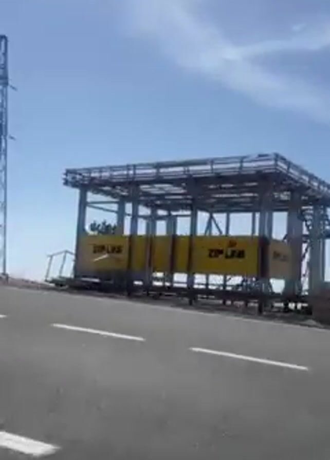 A vehicle travels along an asphalt road on a clear, sunny day. The road is marked with white lines. A stone wall runs parallel to the road on the left side. Initially, a metal structure with stairs is visible over the wall. As the vehicle moves, a tall metal transmission tower comes into view on the left. Further down the road, damaged roadside barriers and signs are seen. The camera then points upwards to the clear blue sky.