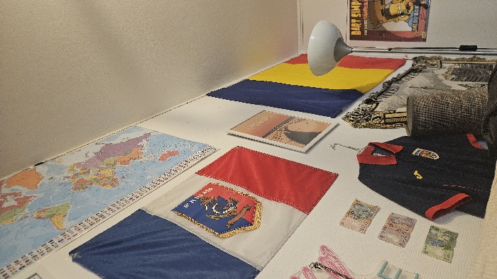 This image depicts an interior room in the city of Lyon, France, characterized by a light-colored wall with a visible slope towards the ceiling, indicative of an attic or mansard space. **Objects and Decor:** * **Wall Decor (Top to Bottom, Left to Right):** * A large, colorful political world map is affixed to the upper left section of the wall, extending towards the sloped ceiling. * Below the map, a flag resembling the French tricolor is partially visible on the far left. * Adjacent to this, a rectangular flag is displayed, featuring a vertical blue stripe, a central white stripe with an elaborate gold-trimmed emblem (depicting an anchor and shield, consistent with the 8th Marine Infantry Parachute Regiment - 8e RPIMA), and a red vertical stripe on the right. * Further right, a framed poster or picture is visible, depicting an architectural structure with arches and containing the text "TAQUEN" at the top. * To the right of the framed picture, a vertically-striped flag with blue, yellow, and red sections (consistent with the flag of Romania) is hung, with its red stripe partially obscured by a lamp. * Below the French military flag and to the left of the framed picture, several banknotes of various denominations and designs are taped to the wall. * Below the banknotes, a dark blue or black short-sleeved sports jersey with red collar and sleeve cuffs is hanging on a hook. The jersey features a "JOMA" logo and a crest on the chest. * Below the framed picture and jersey, a horizontally strung decorative textile or tapestry with intricate dark patterns on a light background is affixed to the wall. * On the far right, a framed poster featuring the character Bart Simpson is visible, with partially legible text including "BART SIMPS..." and "OVER THE MOO...". * **Furniture and Lighting:** * A tall, slender floor lamp with a metallic stand and a white, bowl-shaped uplighter shade stands on the right side of the frame, illuminating the ceiling. * In the lower center-right, a woven cylindrical basket or container with a patterned texture rests on an unseen surface, likely a piece of furniture. * A textured, dark fabric, possibly upholstery or a blanket, is visible in the foreground, suggesting a bed or sofa out of frame. **People and Actions:** No human figures are present in the image. The actions are implied by the arrangement of objects, such as flags being hung, currency taped, and a jersey displayed. **Environment:** The room appears organized, with personal items and decorative elements displayed on the wall and furniture. The sloped ceiling suggests the room is located within the upper part of a building. Artificial lighting from the floor lamp is the primary visible light source.