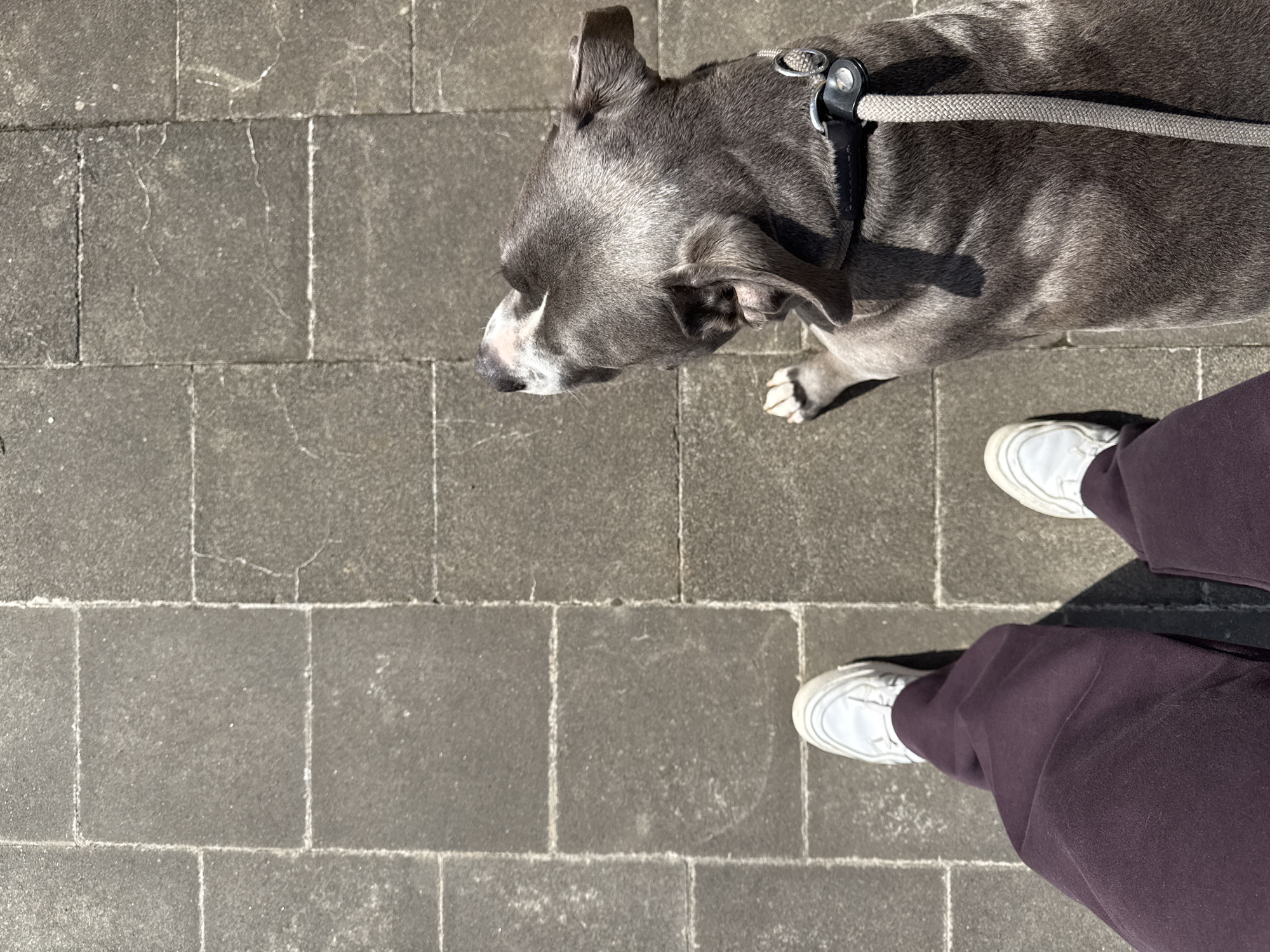 A person wearing white sneakers and dark purple sweatpants stands on a grey tiled sidewalk next to a grey dog with a white nose