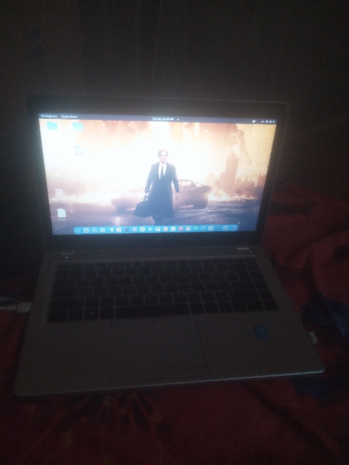 A laptop sits on a bed, the screen displaying an image of a man in a long coat walking away from a burning car. The keyboard is visible, along with the trackpad. A date is shown in the upper right corner of the screen. The laptop is silver in color, and the bedding is red. The surrounding lighting is dim.