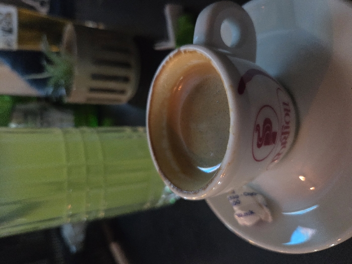 The scene depicts a tabletop arrangement in Negorci, North Macedonia. In the foreground, a white ceramic espresso cup, bearing a red stylized 'S' logo and the text "Pontion", contains dark coffee topped with crema. The cup rests on a matching white ceramic saucer, which also holds a small, white, rectangular sugar packet. Immediately to the left of the espresso cup, a tall, clear glass contains a bright green liquid. The background is out of focus, revealing a small, brown, slatted cylindrical pot holding a green succulent plant. Further obscured elements include a green bottle and a glass containing an amber liquid, consistent with beer. No individuals are visible. The surface supporting these items is dark, suggesting a table or bar top, under what appears to be ambient, somewhat dim lighting.
