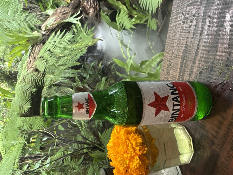A green Bintang beer bottle lies horizontally, covered in condensation, atop a wooden surface. A bright orange marigold flower sits in a glass partially filled with water beneath the bottle. Lush ferns and other greenery surround the beer and flower, creating a tropical or naturalistic setting. The background is blurred, with hints of a misty or watery element.