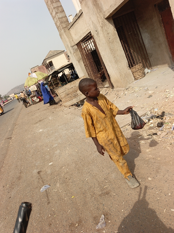 A young boy wearing a mustard-yellow, traditional robe and pants is walking on a dirt and paved street. He holds a small plastic bag. The street is cluttered with trash. In the background, there are several market stalls covered by large umbrellas and a few buildings. A person in a blue robe stands by one of the stalls. The sky is overcast and bright.