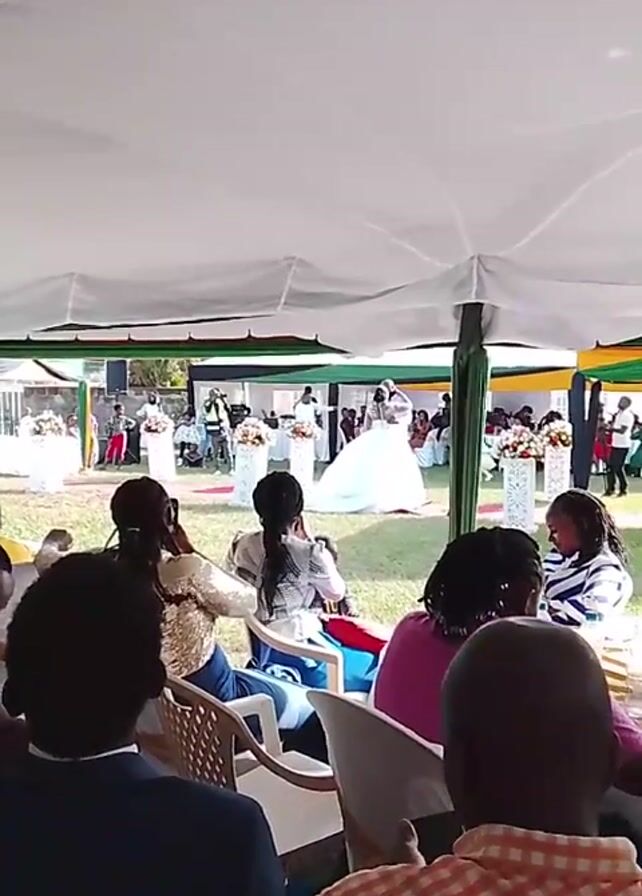 The video captures a wedding scene from under a large white tent, where guests are seated, facing a couple dancing on a green lawn. The bride is wearing a large white dress. The guests are sitting in white chairs, some are wearing casual clothing, and one woman is using a phone to take photos. The scene is decorated with flower arrangements.