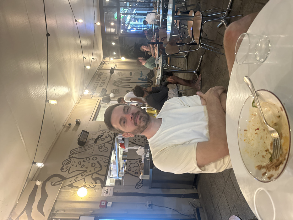 A man sits at a table in a restaurant, an empty plate and a water glass beside him. He wears a white t-shirt. The restaurant features an illustration of a leopard on the wall, along with a sign that reads "PEACE & COFFEE FOR ALL." Other patrons are visible in the background. String lights hang from the ceiling.