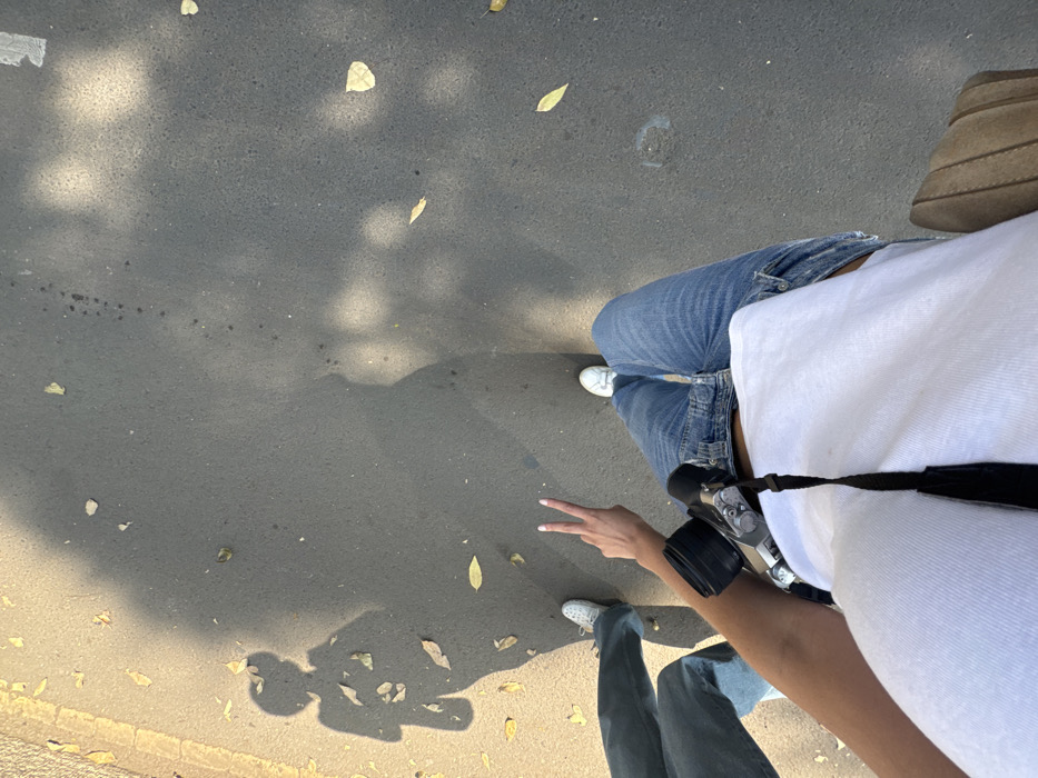 An overhead photograph depicts two individuals walking on an asphalt street in Mexico City, Mexico. The person in the foreground is visible from the mid-torso down, wearing a white t-shirt, blue denim jeans, and white sneakers. A camera with a black strap is positioned on their chest, and their right hand is raised to form a peace sign. A segment of a brown bag is partially visible at the bottom right. To the left, the lower legs and white sneakers of a second individual are visible, accompanied by their distinct shadow on the asphalt, which shows a figure carrying a shoulder bag. The street surface is dark gray asphalt, sparsely covered with scattered yellowed leaves. A faded yellow line, indicative of a curb or lane marking, runs along the left edge of the pavement. Strong overhead sunlight casts defined shadows and dappled light patterns across the ground.