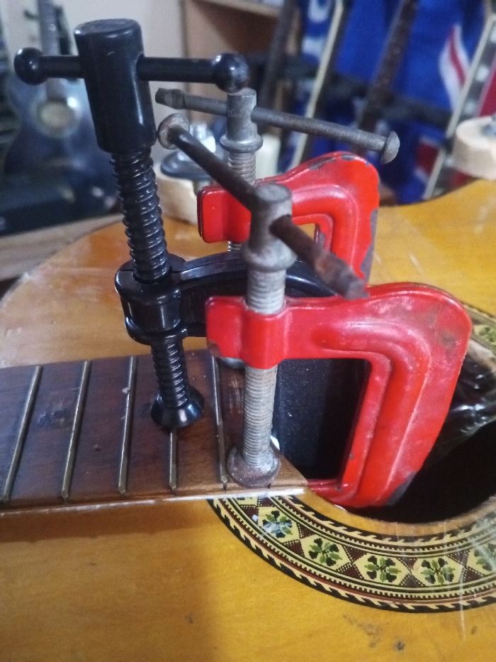 guitar under repair. A section of the fretboard has been glued and is being held in place by three clamps. Two are red, positioned near the soundhole, and one is black, closer to the guitar's headstock. The guitar body is light brown, and the soundhole is decorated with a floral pattern. The fretboard is dark brown. The background is blurry, showing parts of other instruments and shelving.