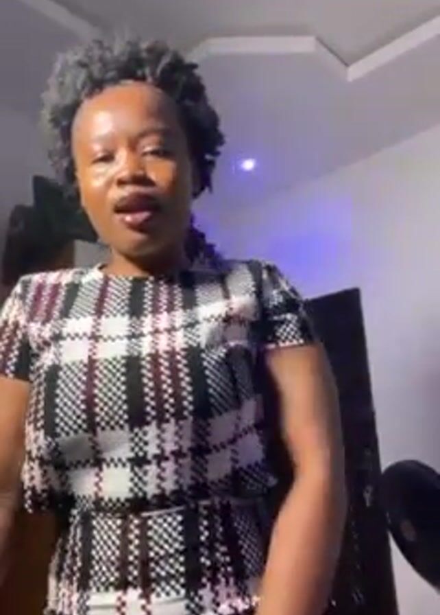 A young woman with short, dark, curly hair is standing and gesturing in a room, likely singing or speaking energetically