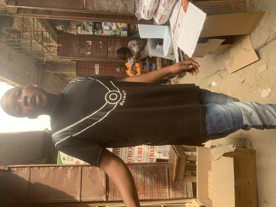 The image depicts an outdoor commercial area within the city of Fegge, Nigeria. A young adult male, of dark complexion and short dark hair, is positioned prominently in the foreground, facing the camera with his mouth slightly open. He wears a black short-sleeved t-shirt with a white graphic design featuring a stylized necklace and the word "Balmain," paired with blue jeans. His left arm is partially visible, extended to the left of the frame. To the left of the foreground subject, a shop entrance with a rusty metal door or shutter is visible. A partially obscured vertical sign displays text including "CURE," "COLD," and "Chlorpheniramine Maleate Capsule." A small wooden stool rests near this entrance. On the ground, an open cardboard box containing small, light-colored packages is present. To the right and behind the foreground subject, another shop entrance, also with a rusty metal door or shutter, reveals shelves stocked with numerous small boxes and bottles, indicative of a pharmacy or medical supply store. Two individuals are seated within this entrance: an older male wearing an orange shirt on a blue plastic chair, and a female with dreadlocks wearing a light-colored top and pants on a white plastic chair. The female is looking down at and interacting with a smartphone held in her hands. Adjacent to these individuals, stacks of white packaged goods are visible, along with an open cardboard box on the ground. The ground surface is rough and uneven, consisting of dirt and possibly broken concrete. The overall lighting suggests an outdoor daytime setting under diffuse or overcast conditions.