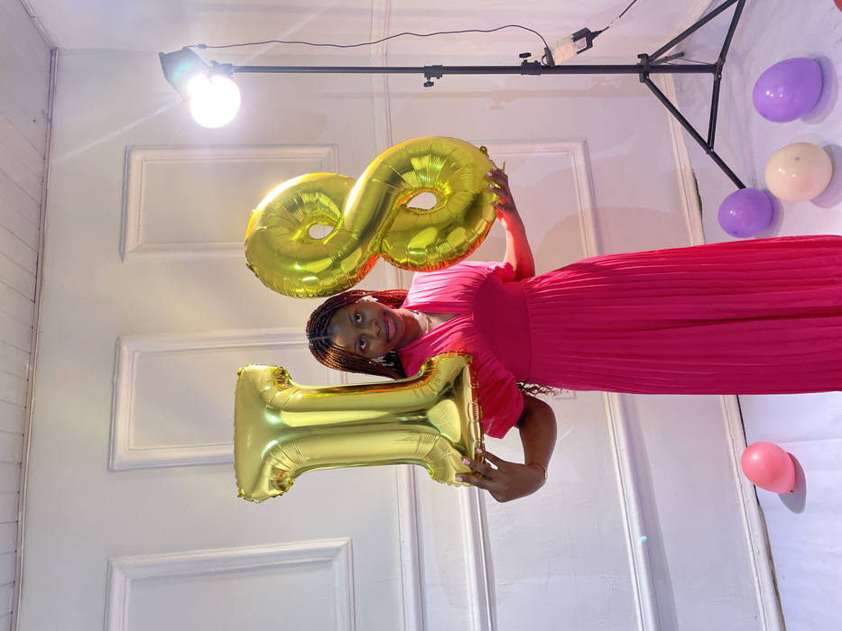 A young woman in a bright pink dress smiles while holding gold foil balloons shaped like the numbers "1" and "8," indicating she is celebrating her 18th birthday