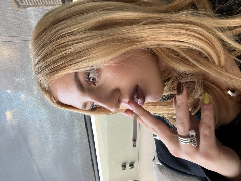 A blonde-haired female individual is depicted indoors at Santiago Yancuitlalpan, Mexico, shown in a profile view from the chest up. She has fair skin, brown eyes, and wears dark plum lipstick. Her left hand is raised, holding a lit cigarette, actively burning with an ash tip, between her left index finger and thumb. The cigarette filter is partially visible with the letters "CAB" printed on it. She wears a silver-toned multi-band ring with a safety pin motif on her left ring finger. Her left fingernails are painted in varied colors: light pink on the index finger and thumb, dark brown on the middle finger, and yellow-green on the ring finger. She is wearing a dark garment, likely a blazer, and a silver-toned necklace pendant is visible. The background reveals a window or reflective panel displaying reflections of clouds and a portion of a building structure. A light-colored upholstered surface is present behind her left shoulder, and two silver-toned circular fixtures are mounted on a reflective surface to the left of the cigarette. The woman's head is turned to her right, with her gaze directed slightly upwards and her lips parted.