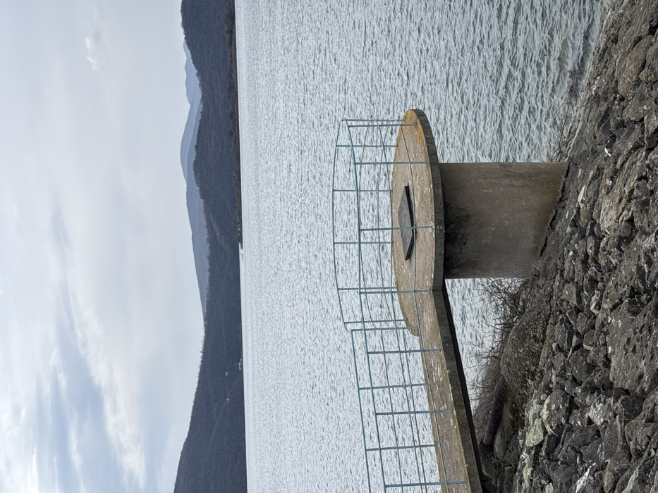 The image depicts a tranquil outdoor scene on an overcast day, located near the city of Баня, Bulgaria, featuring a concrete observation platform extending over a large body of water, likely a reservoir or dam. In the foreground, a steeply sloped embankment covered with dark, irregularly shaped rocks and minimal dry vegetation transitions into the water. A concrete walkway, supported by a robust, cylindrical concrete pillar that disappears towards the water level, extends from the embankment to a circular concrete platform. Both the walkway and the platform are equipped with a light blue metal railing, consisting of multiple horizontal bars and vertical supports, encircling the platform and lining the walkway. A dark, square metal hatch is visibly embedded in the surface of the circular platform. The midground is dominated by a vast expanse of grey-blue water, exhibiting subtle ripples across its surface. In the background, a series of dark blue-grey hills and mountains with indistinct tree cover rise, defining the distant shoreline. A faint, light-colored structure, possibly a building, is discernible on one of the hillsides to the left. The sky is uniformly overcast, presenting a soft, diffused light across the entire scene. No people or animals are visible.