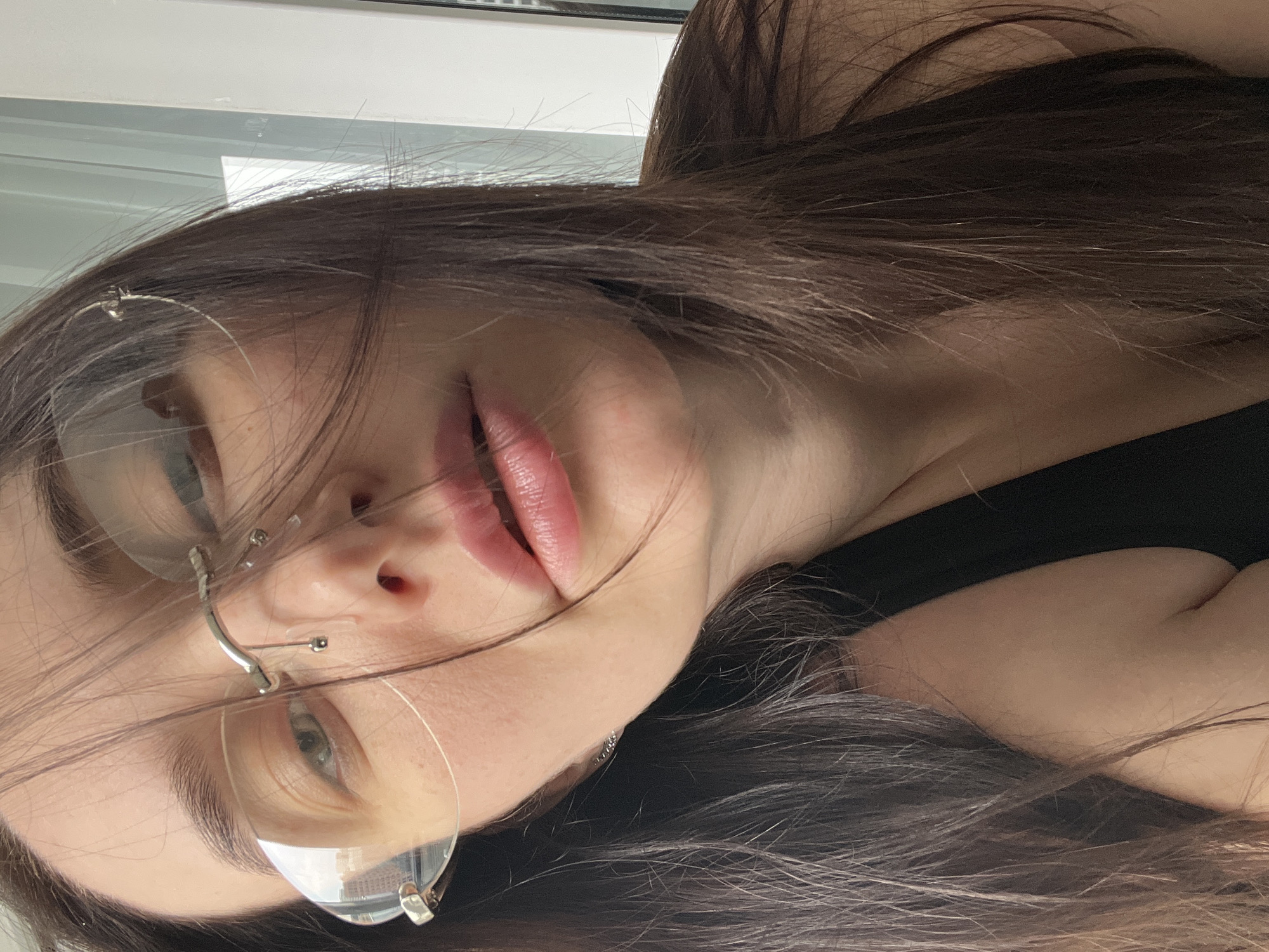 The image is a close-up selfie of a woman. She has long, dark brown hair with some lighter strands. She is wearing glasses with a silver frame. Her lips are full and appear to have some lipstick or gloss. She is wearing a black top, possibly a tank top. The background is out of focus, but appears to be a window. There is no information about the location or any actions or interactions in the image.