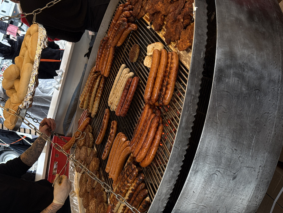 - "A large, circular, multi-tiered metal grill is central, actively cooking a variety of meats over glowing coals" by FM-k63fK2, licensed under CC BY 4.0